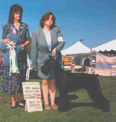Yashanti's Adagio v Silber Wald (Ada) OFA Excellent GSC-2530E24F-T Thyroid-Normal Features: The most impressive thing about Ada's appearance is her incredible and unusual substance. She represents the standard of the Giant Schnauzer as it outlines a dog that is a larger, more robust version of the standard schnauzer. Often when people go over her they respond... now that's a Schnauzer! With substance often lacking in the breed she has much to offer. Ada is not only substantial but she is also short bodied, square and very muscular. She has an outstanding front end, forechest, and depth of chest as well as a lovely rear. Her eye is dark and sharp- the hallmark of the giant expression. Ada moves like she is floating on a cloud traveling ever so effortlessly, sound and correct. Ada is a sweet, quiet lady yet she has a powerful presence like that of royalty. Tho she is always respectful of others she really just enjoys being with her family and seldom cares to make a big deal of visiting with strangers. She will be friendly and after awhile decide that the affection of visitors appeals to her but she really is fulfilled by being near those she loves. Ada too is incredibly intelligent often learning new tasks in a matter of seconds and with only one simple demonstration, She desires to express this intelligence and delights in working and playing with her loved ones in any sport introduced to her. She is ready to be titled in novice when she is back on her feet. Ada is also an outstanding dancer with an extended trot that can only be described as breathtaking. Ada finished her championship in real style having won both her majors at specialties. Each were 5 point majors and the one time she competed in Puppy Sweepstakes she won Best Puppy. To top that all off she won a Group 3 out of the puppy classes at Salisbury, Maryland in 1998. A truly outstanding Giant Schnauzer!